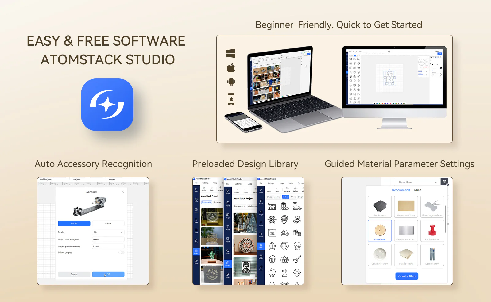 | Materijali za sečenje/graviranje | Laser sa diodom: Drvo, bambus, papir, koža, pluta, kamen, filc, MDF, tkanine, karton, obojeni metal, crni akril. IR Laser: Nerđajući čelik, aluminijum, mesing, gvožđe, zlato, srebro, platina, titan, crni akril, plastika itd. |